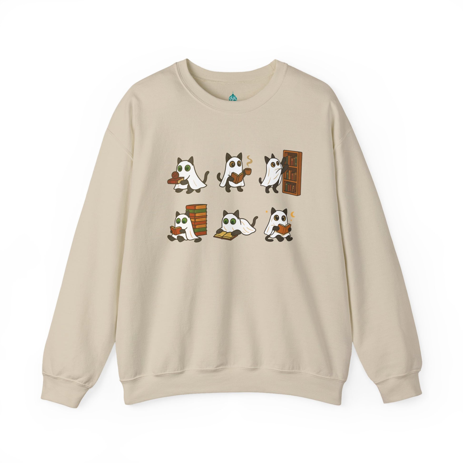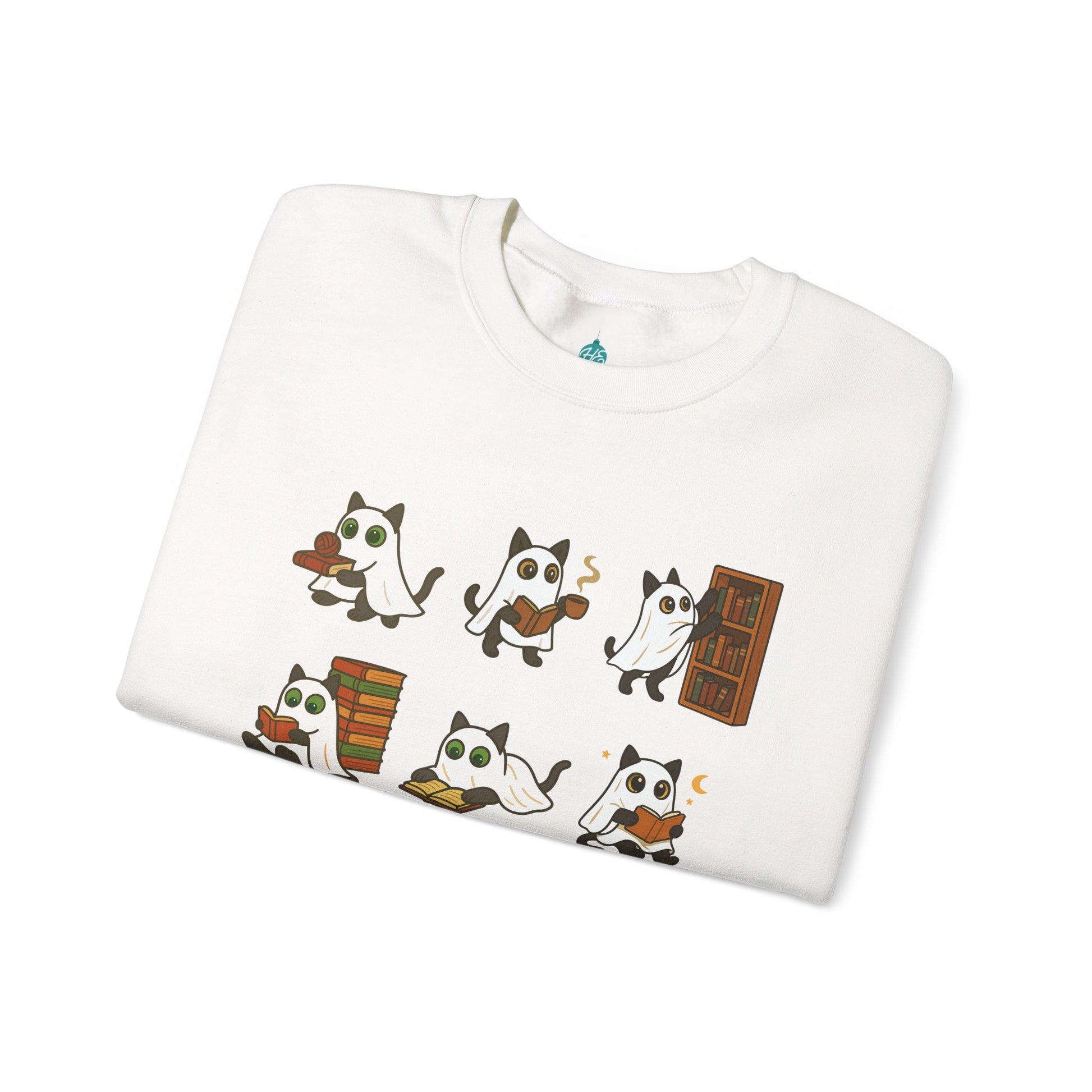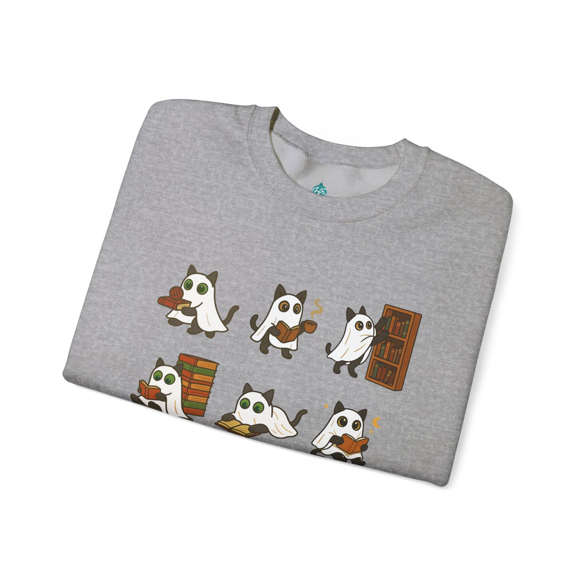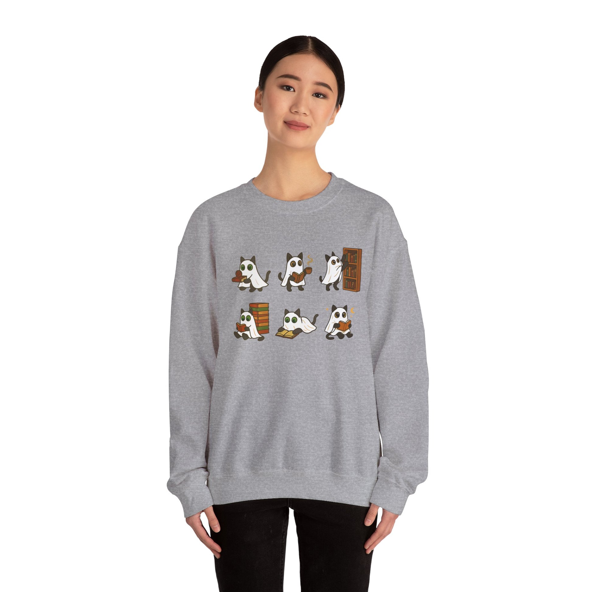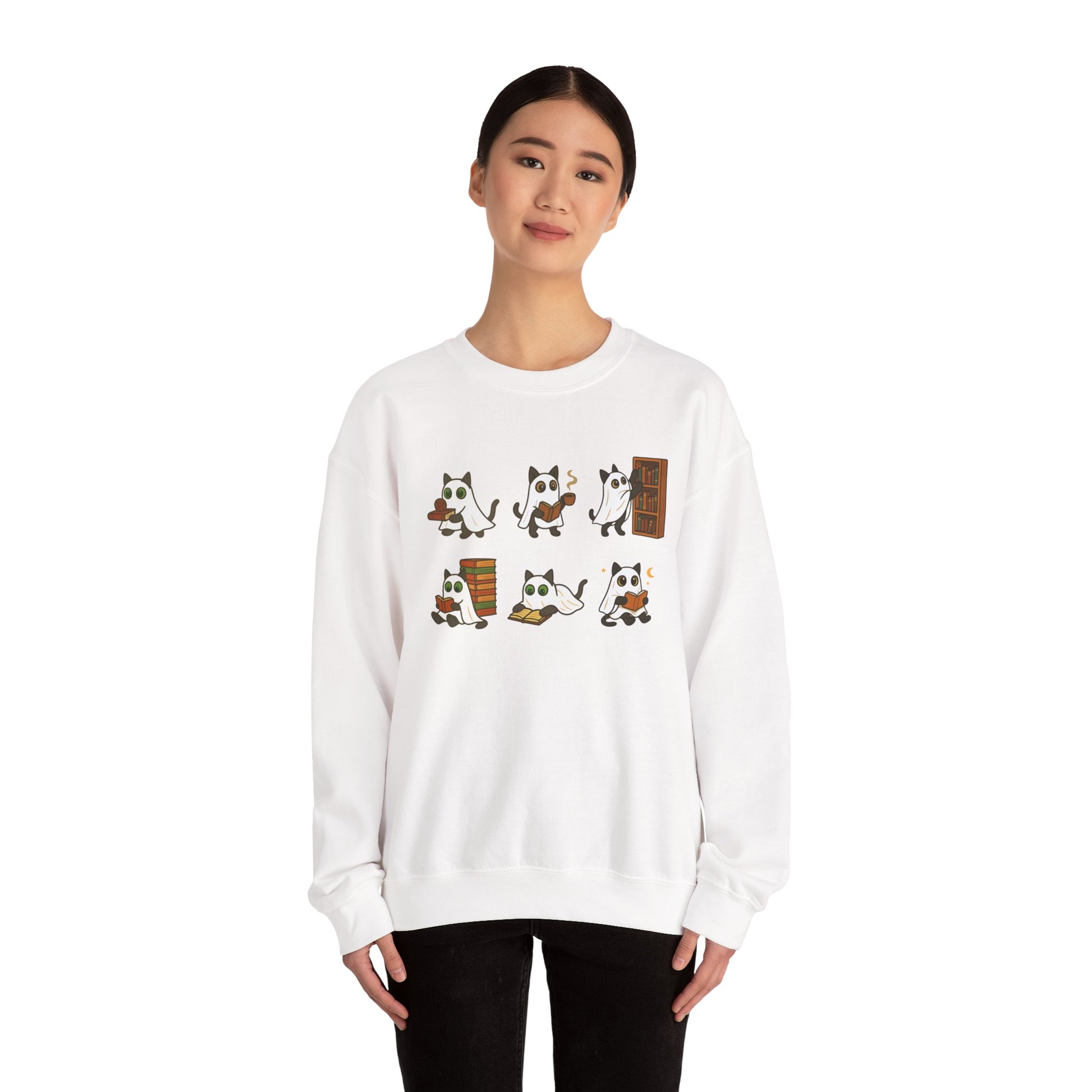 Get ready for spooky season with our Gildan 1800 Cozy Cat Sweatshirt! This Black Cat Ghost Halloween sweatshirt is perfect for cat and book lovers who want to celebrate Halloween in style.