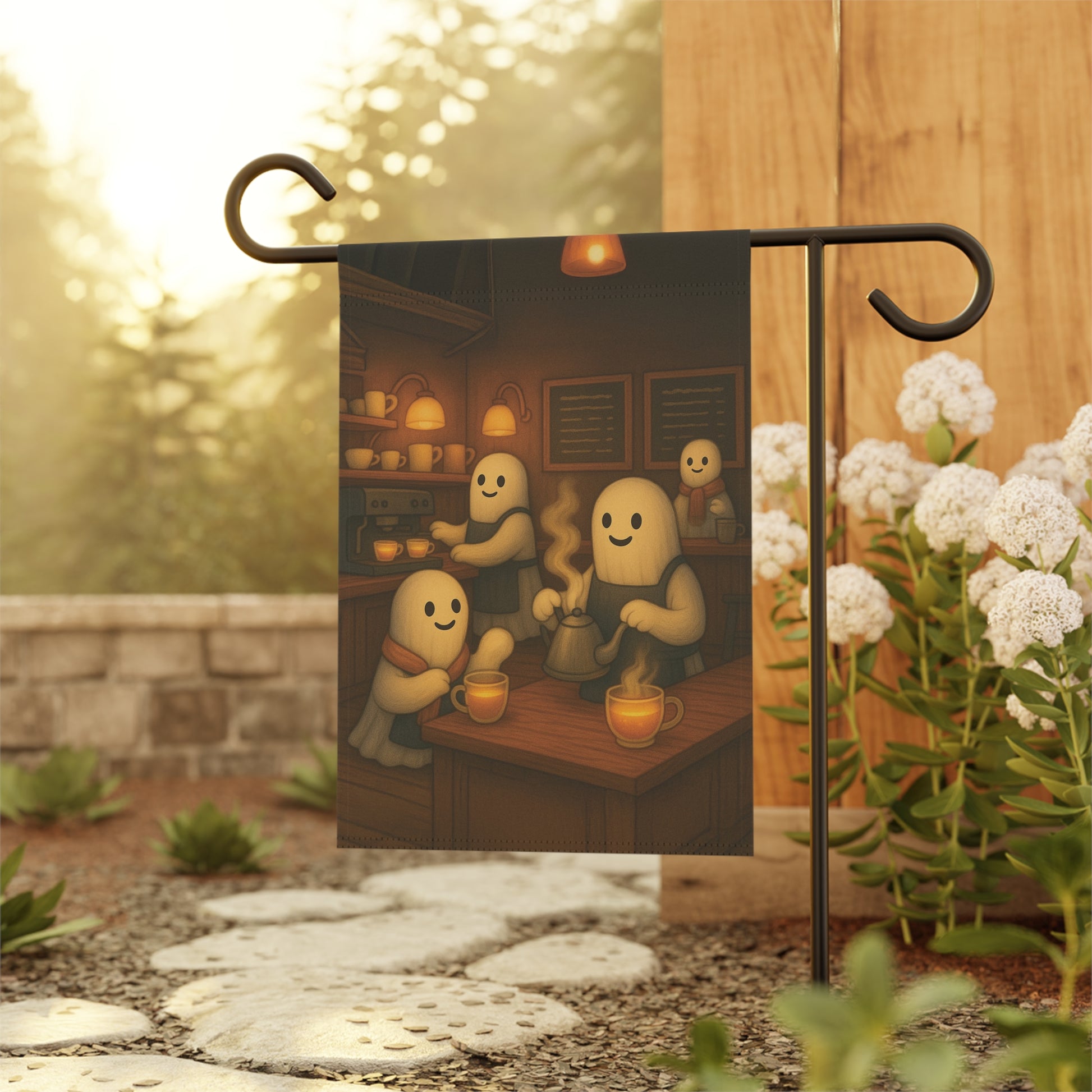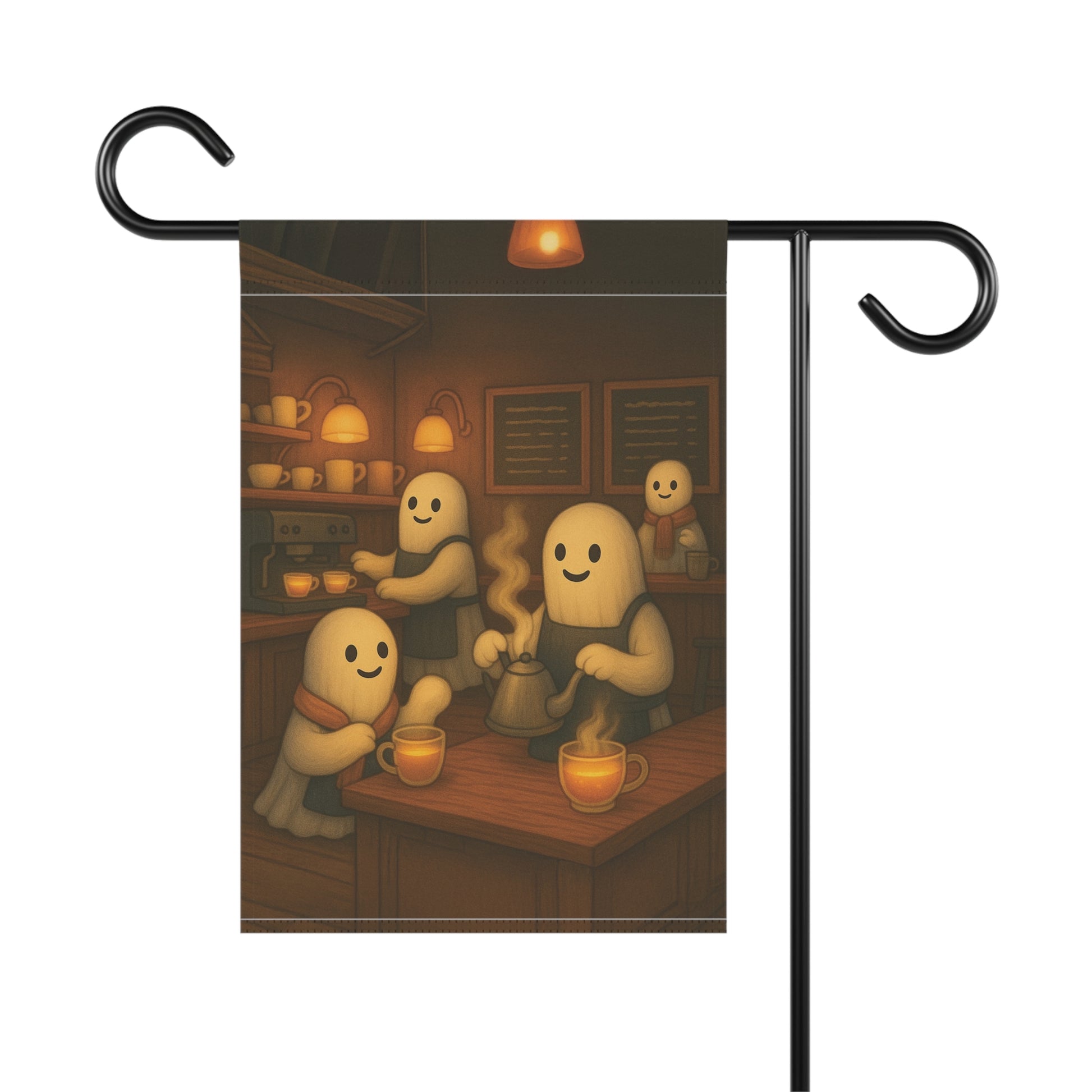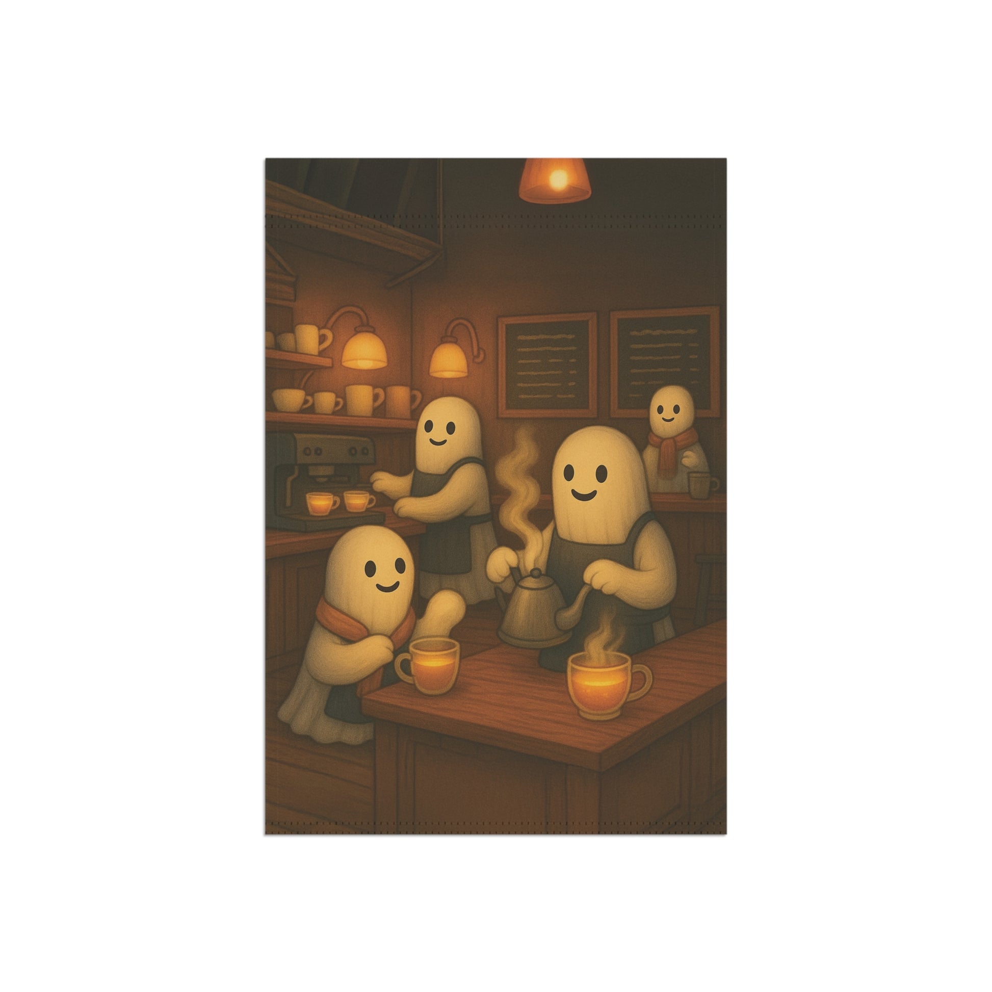 Add a warm and inviting touch to your outdoor space with this charming garden banner. Perfect for celebrating the autumn season, this decorative piece features a delightful ghost tea shop scene. Its whimsical design is sure to catch the eye of visitors, making it an ideal addition for family and friend gatherings. Each piece is thoughtfully designed by us with the help of AI, then professionally produced by a trusted print provider to ensure stunning quality and lasting beauty.