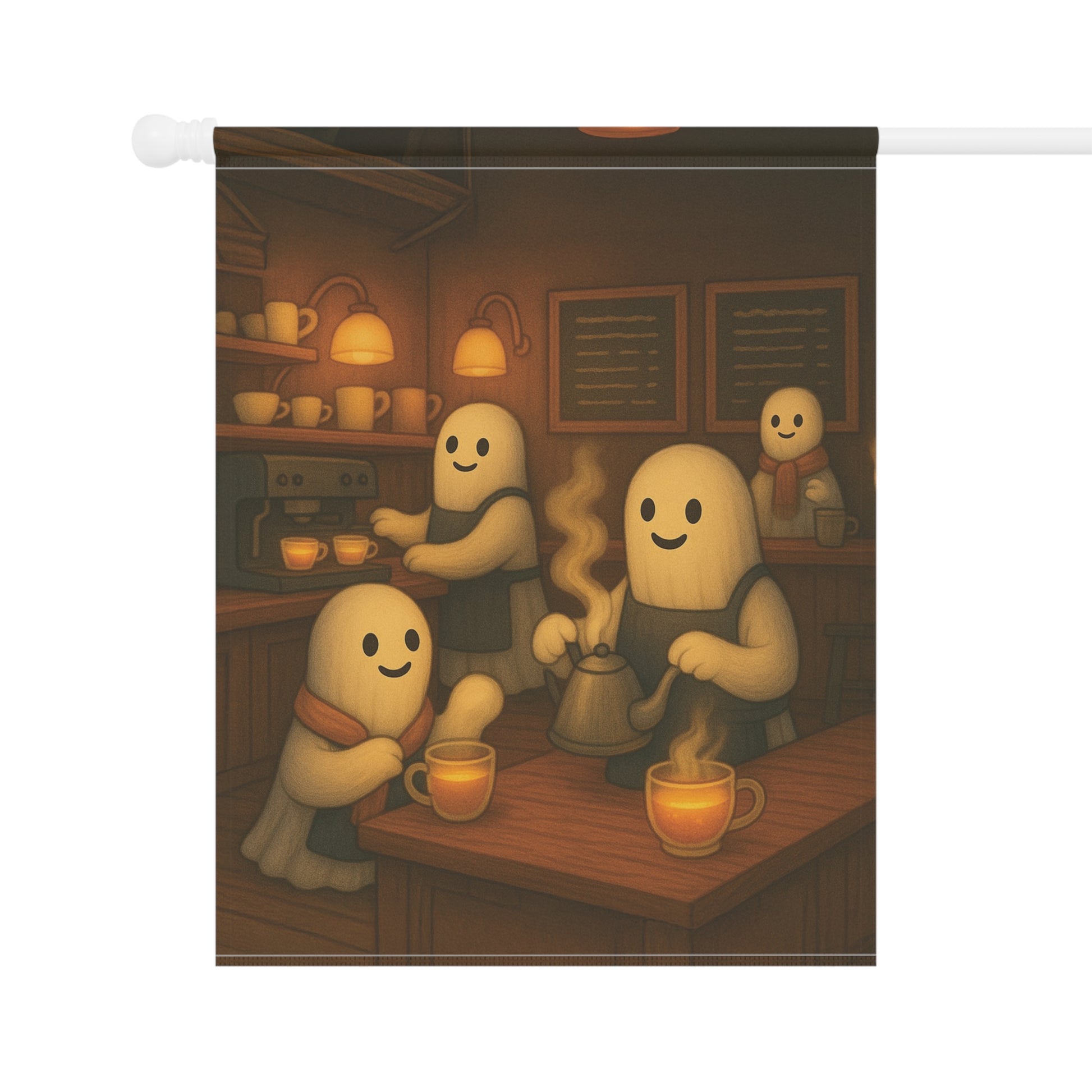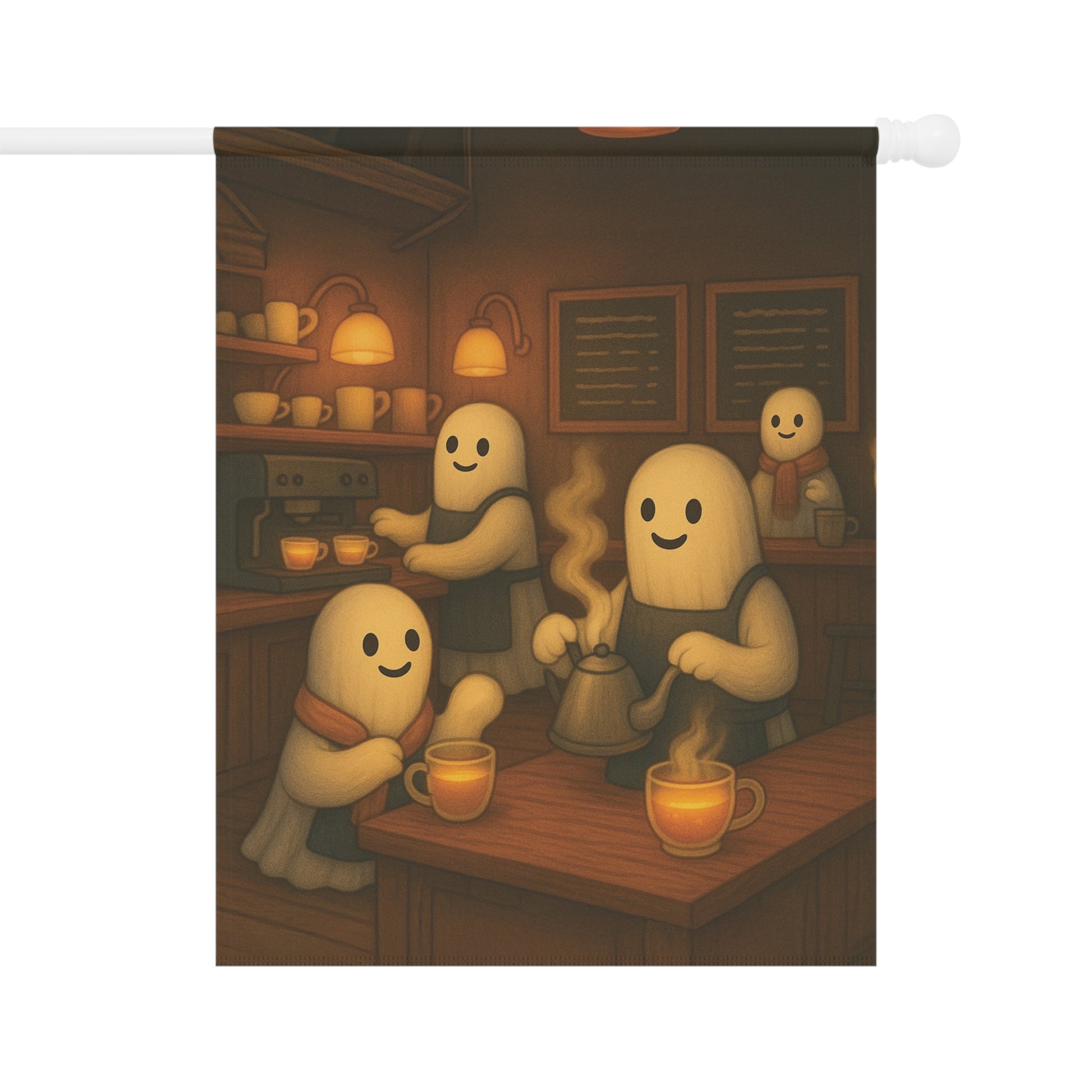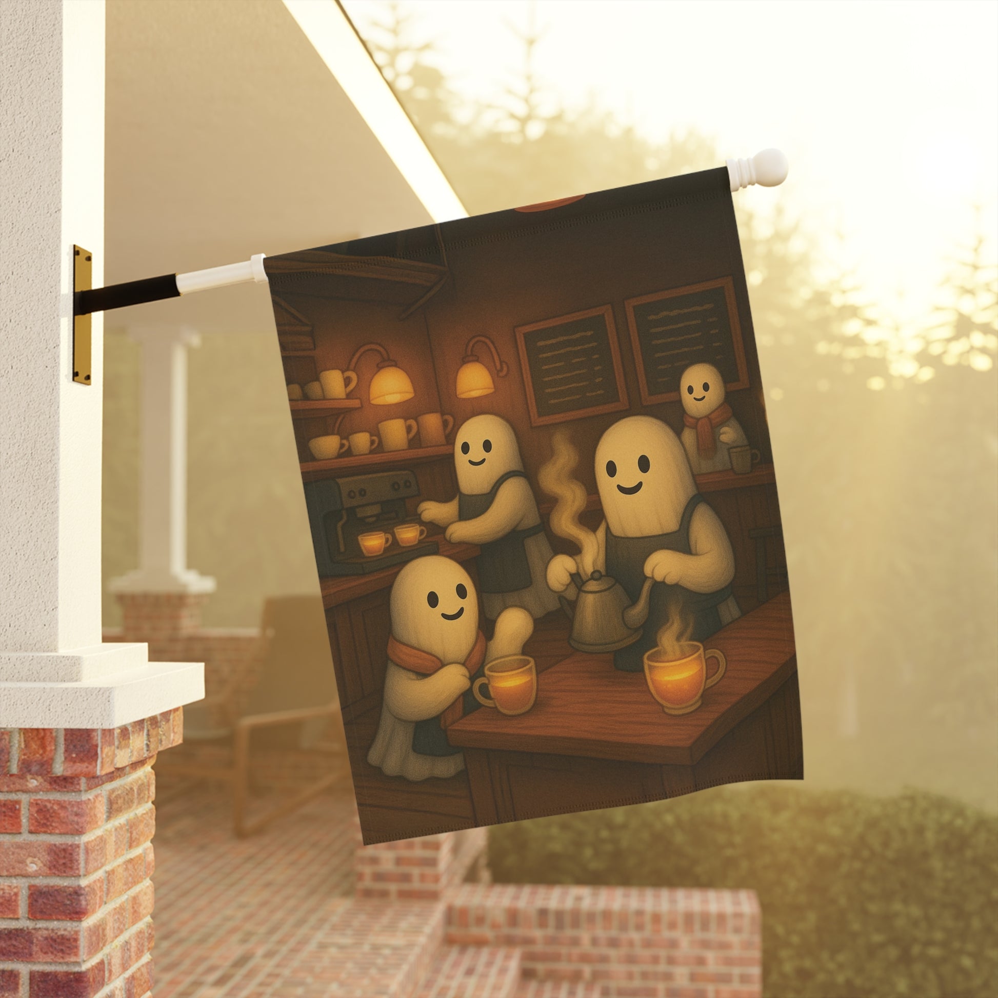 Add a warm and inviting touch to your outdoor space with this charming garden banner. Perfect for celebrating the autumn season, this decorative piece features a delightful ghost tea shop scene. Its whimsical design is sure to catch the eye of visitors, making it an ideal addition for family and friend gatherings. Each piece is thoughtfully designed by us with the help of AI, then professionally produced by a trusted print provider to ensure stunning quality and lasting beauty.