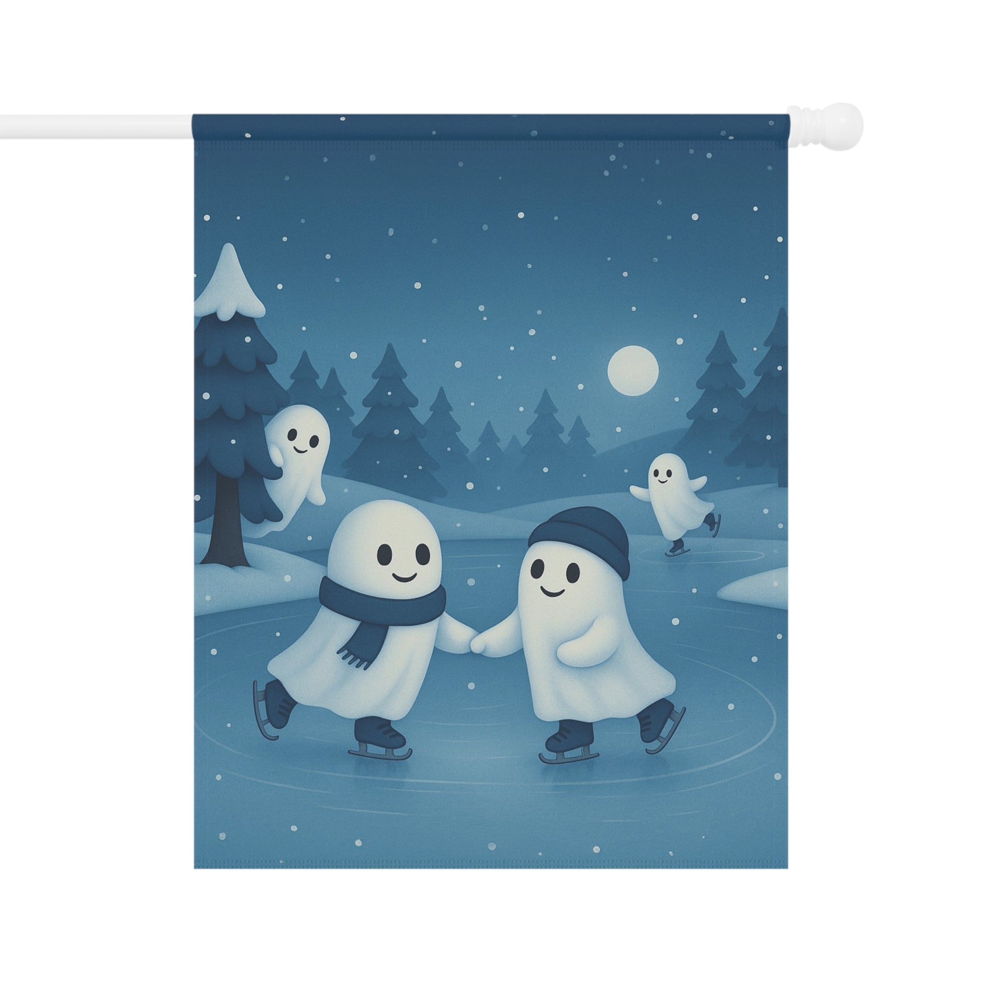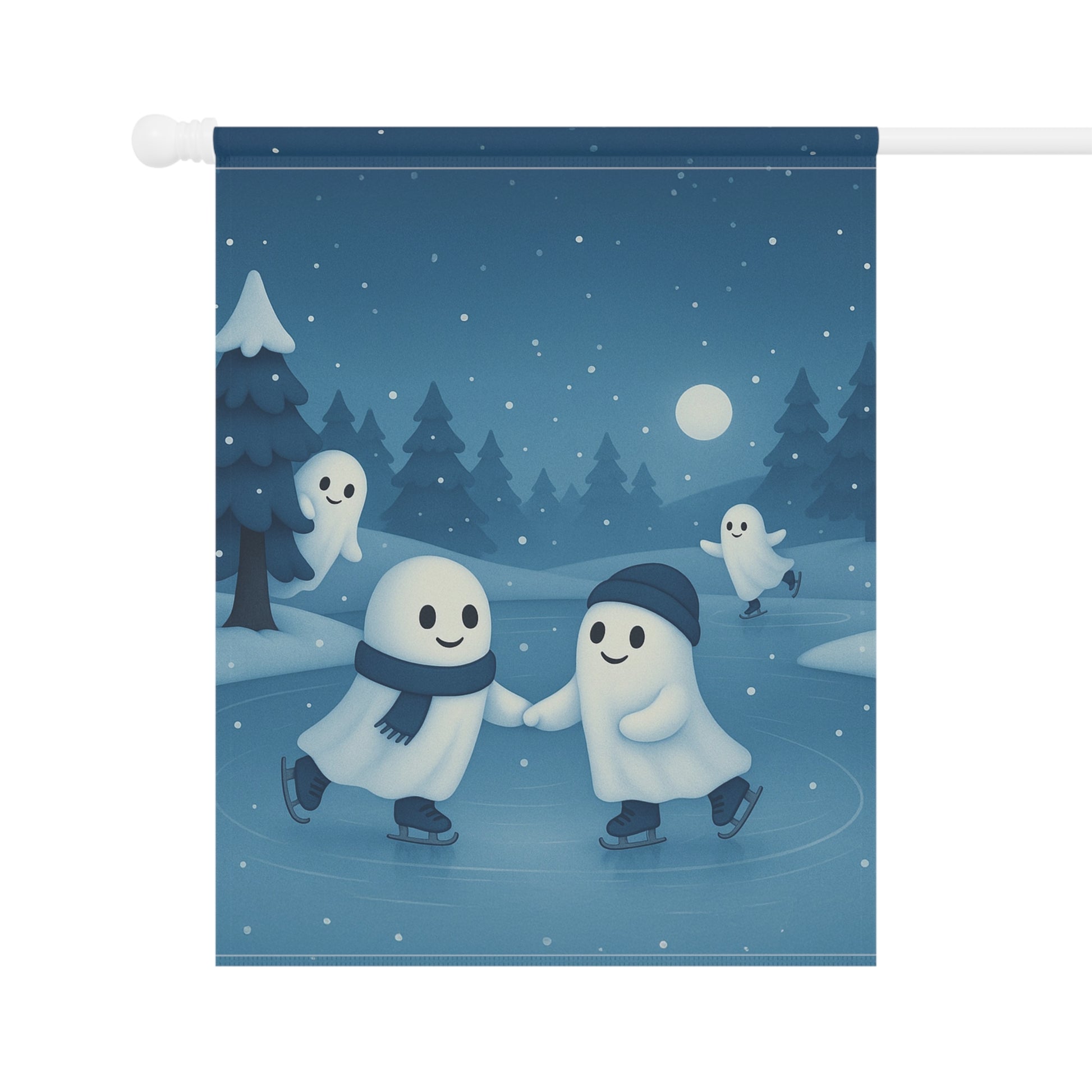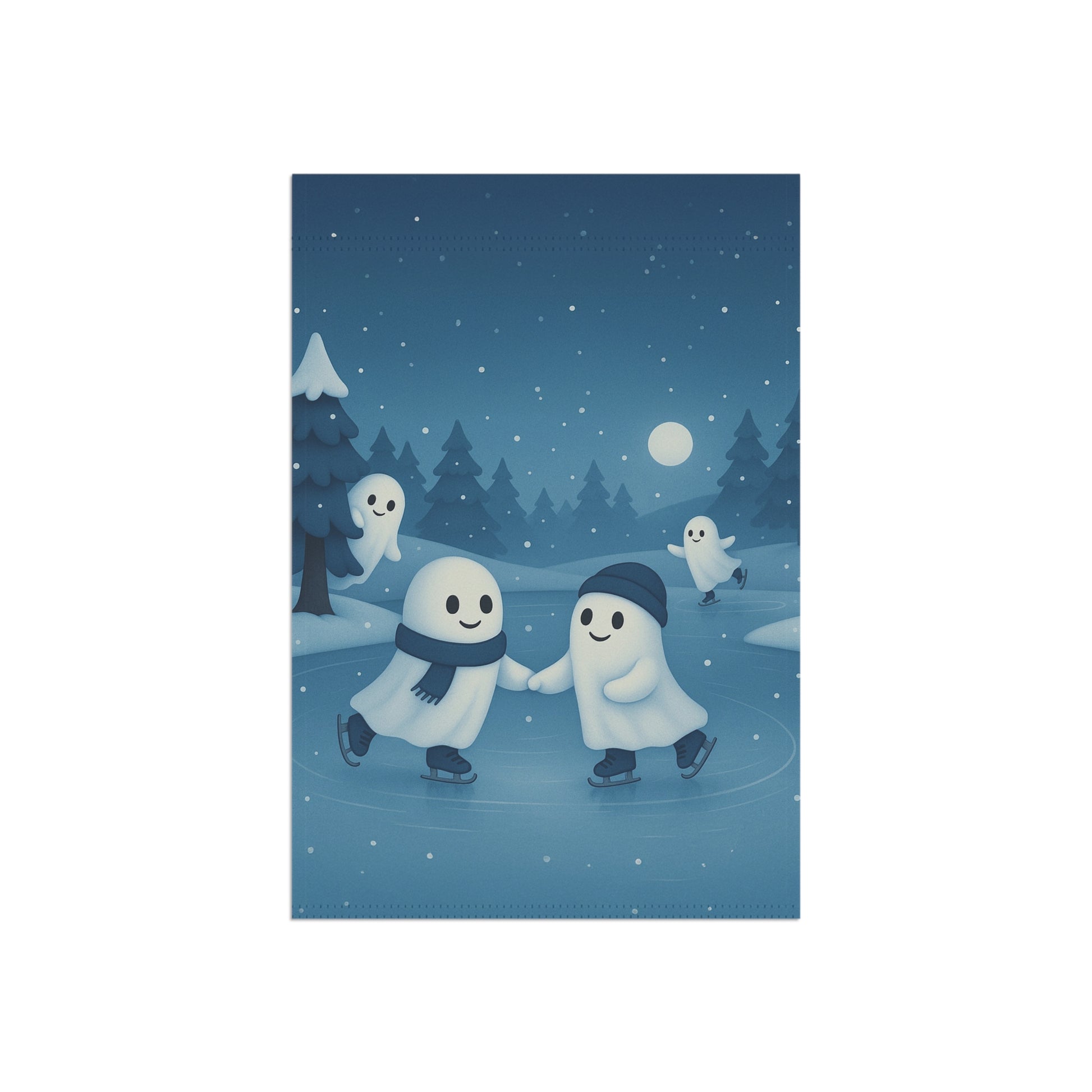 Ghosts Ice Skating on Lake Garden Flag, Winter Yard Flag, Cute Ghost Outdoor Banner, Cozy Ghost Lawn Decor, Whimsical Winter Flag