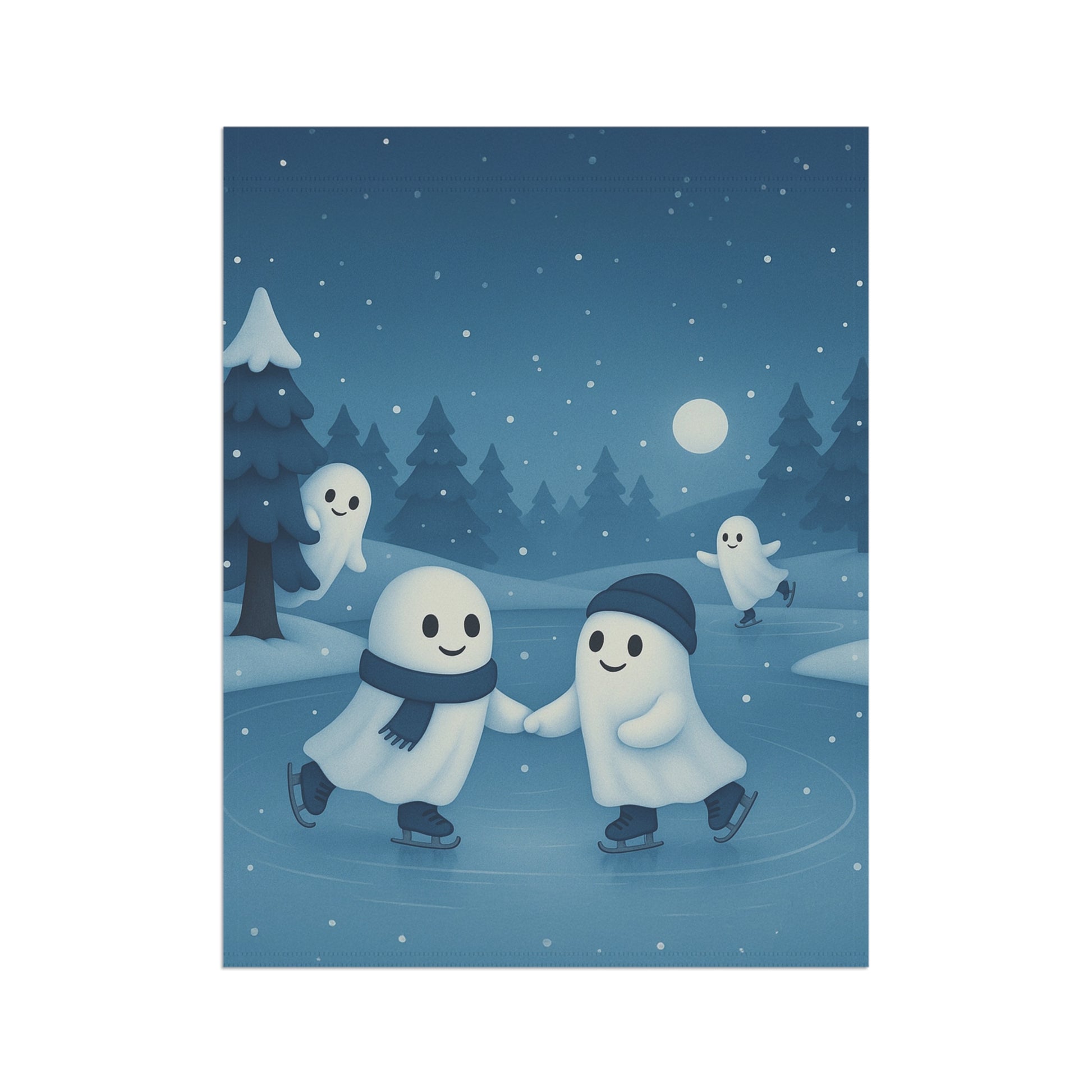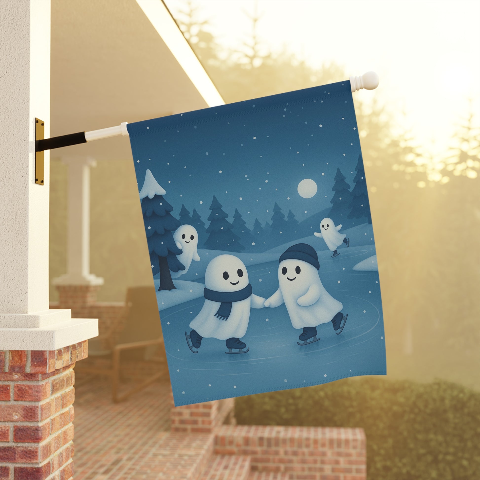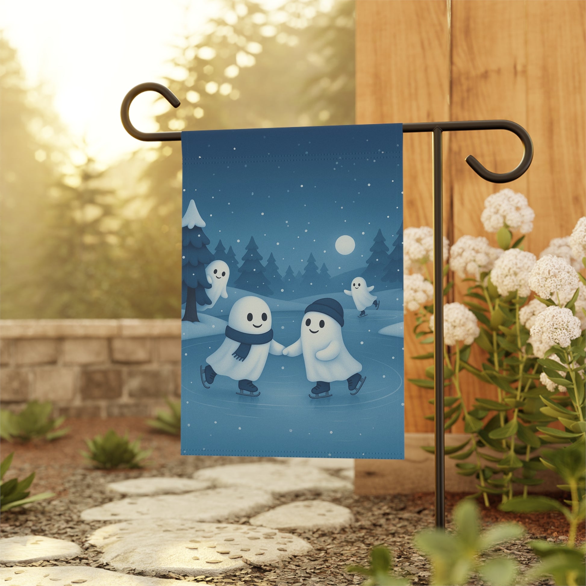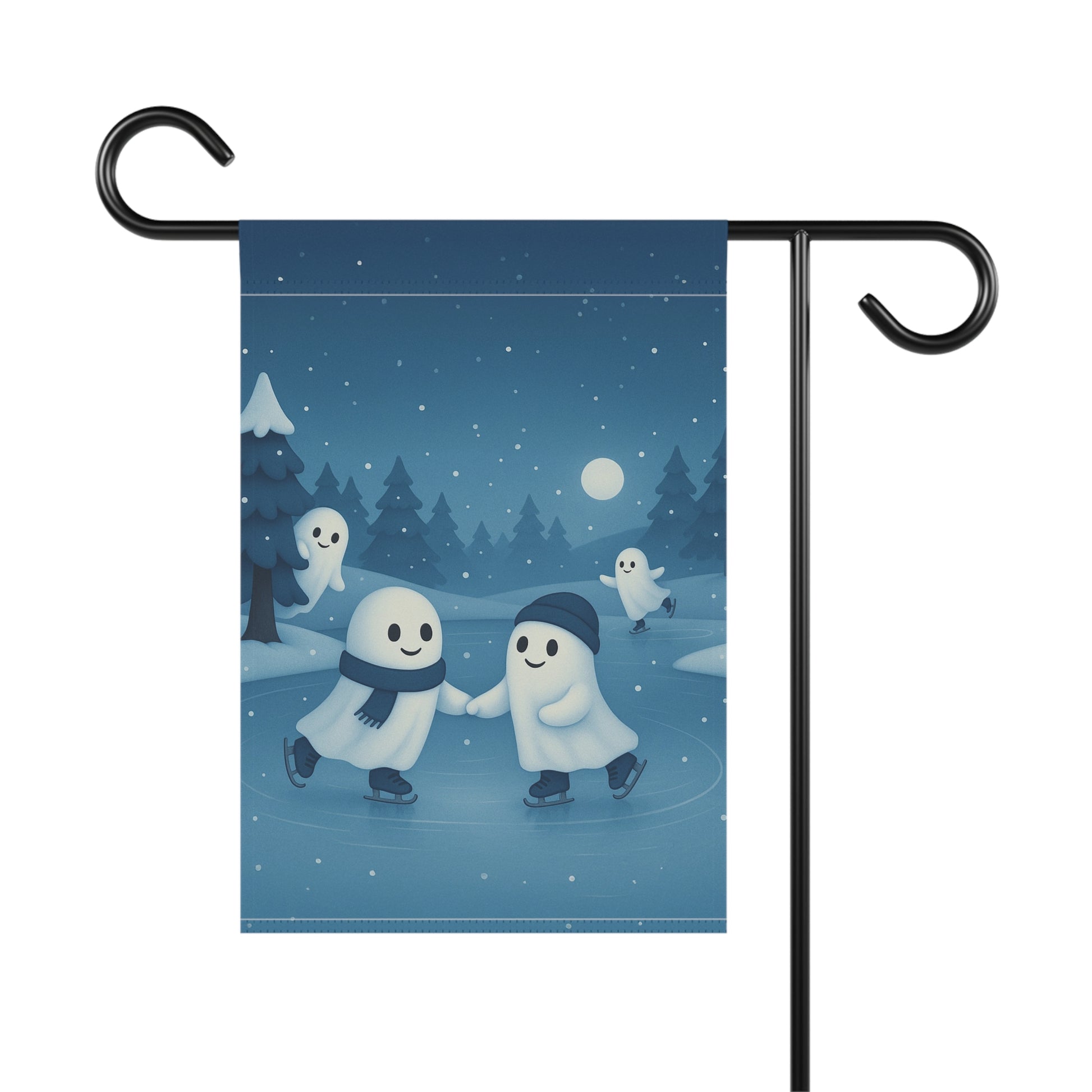 Ghosts Ice Skating on Lake Garden Flag, Winter Yard Flag, Cute Ghost Outdoor Banner, Cozy Ghost Lawn Decor, Whimsical Winter Flag