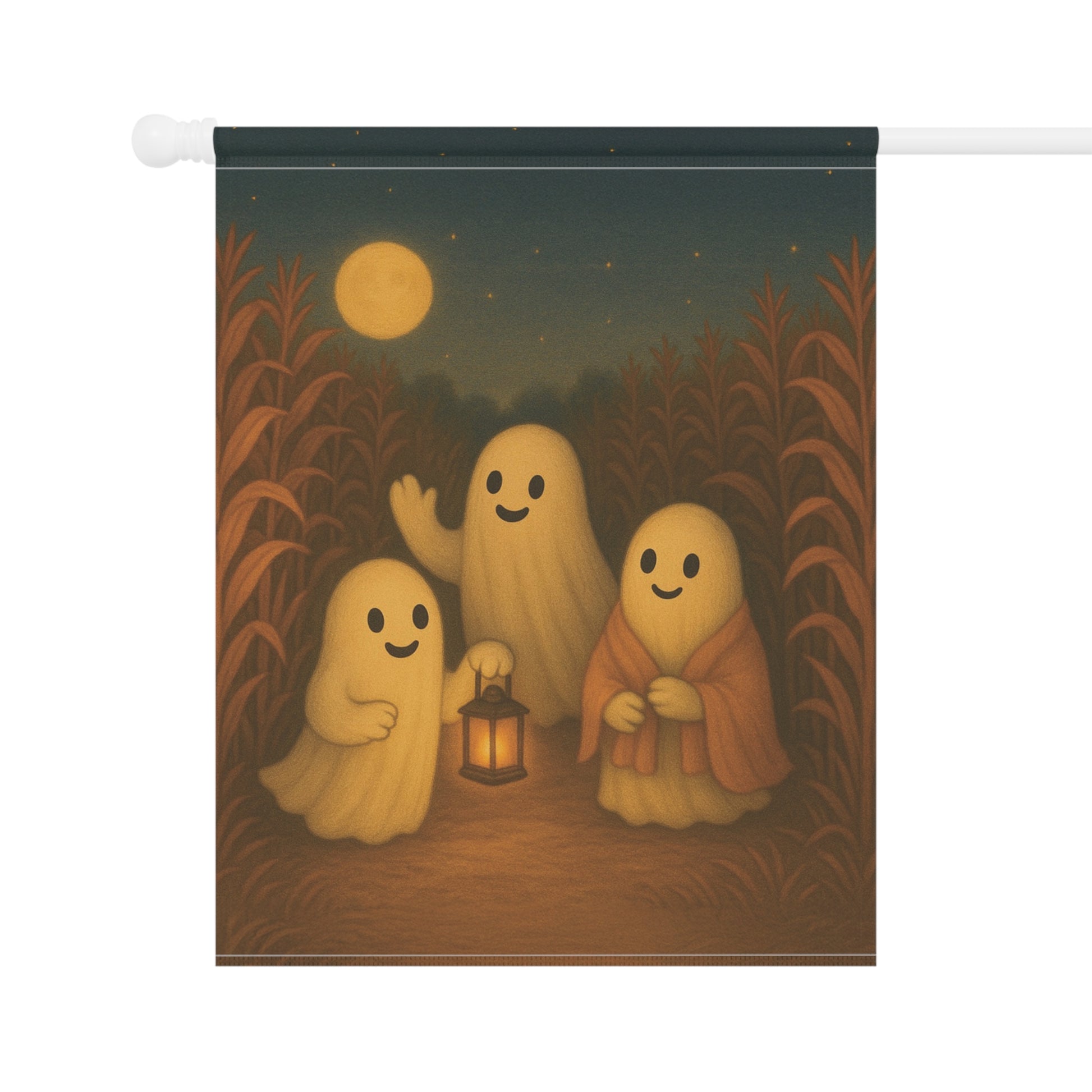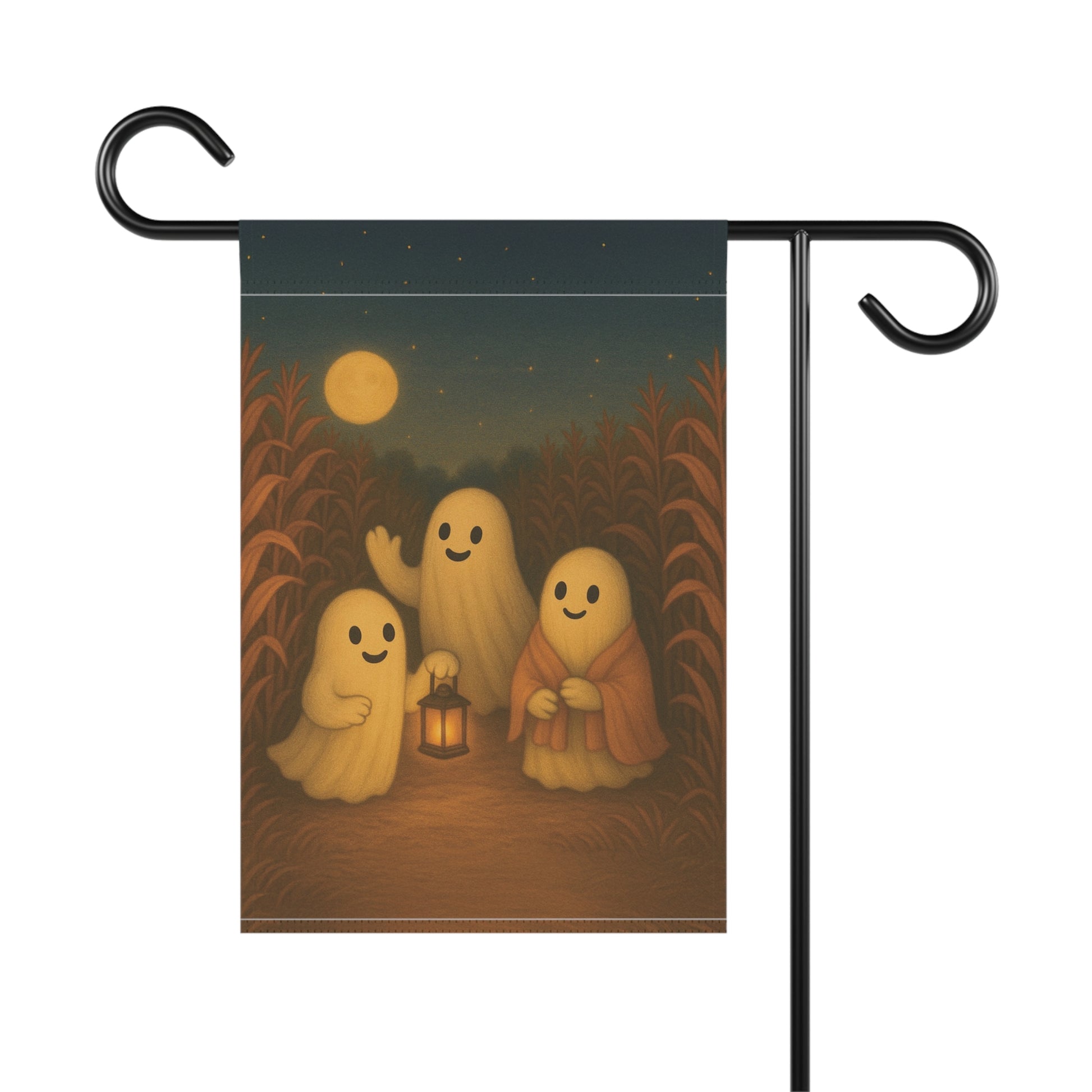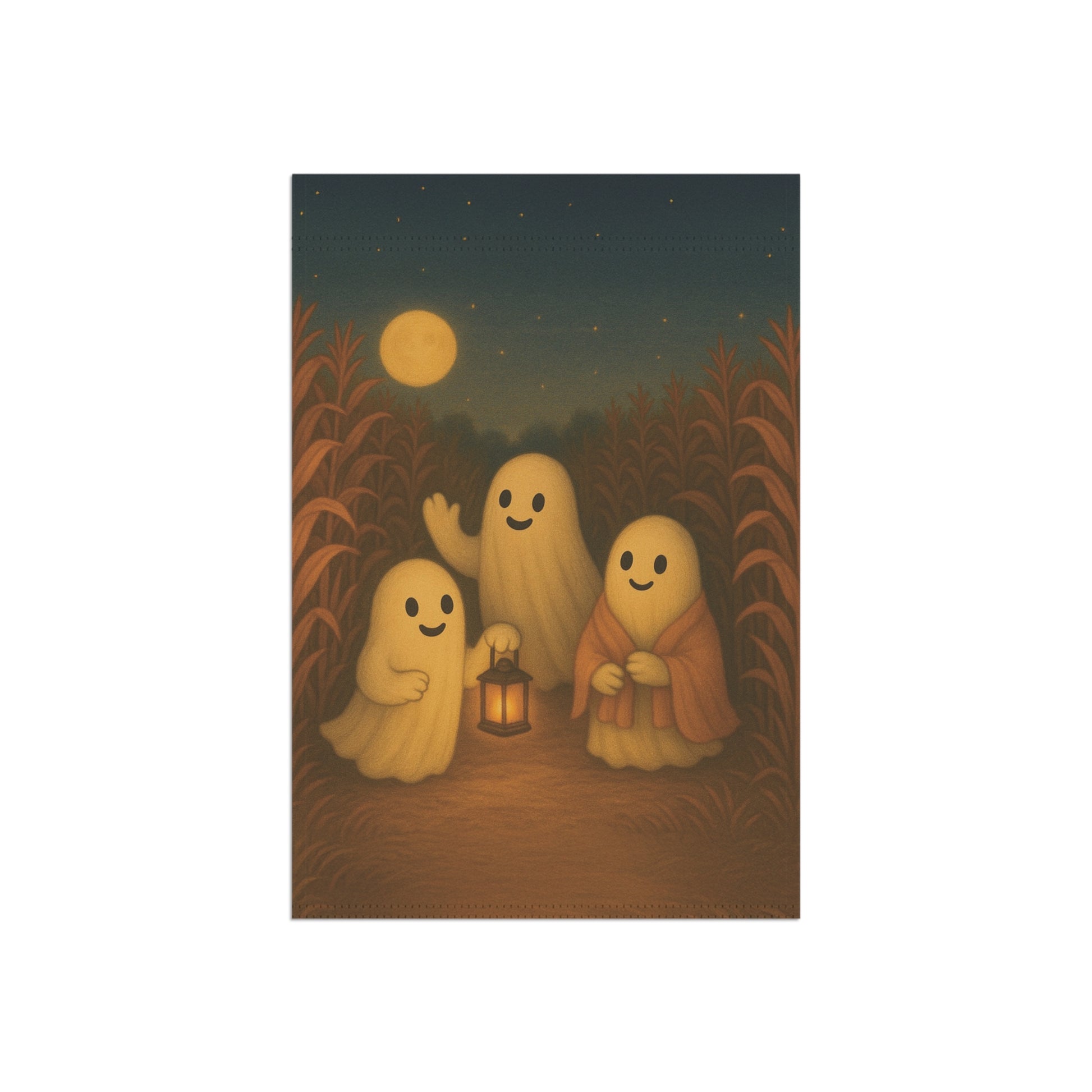 Add a warm and inviting touch to your outdoor space with this charming garden banner. Perfect for celebrating the autumn season, this decorative piece features a delightful ghosts in a corn field scene that brings a sense of fall fun. Its warm colors and whimsical design are sure to catch the eye of visitors, making it an ideal addition for family and friend gatherings. Each piece is thoughtfully designed by us with the help of AI, then professionally produced by a trusted print provider to ensure stunning quality and lasting beauty.