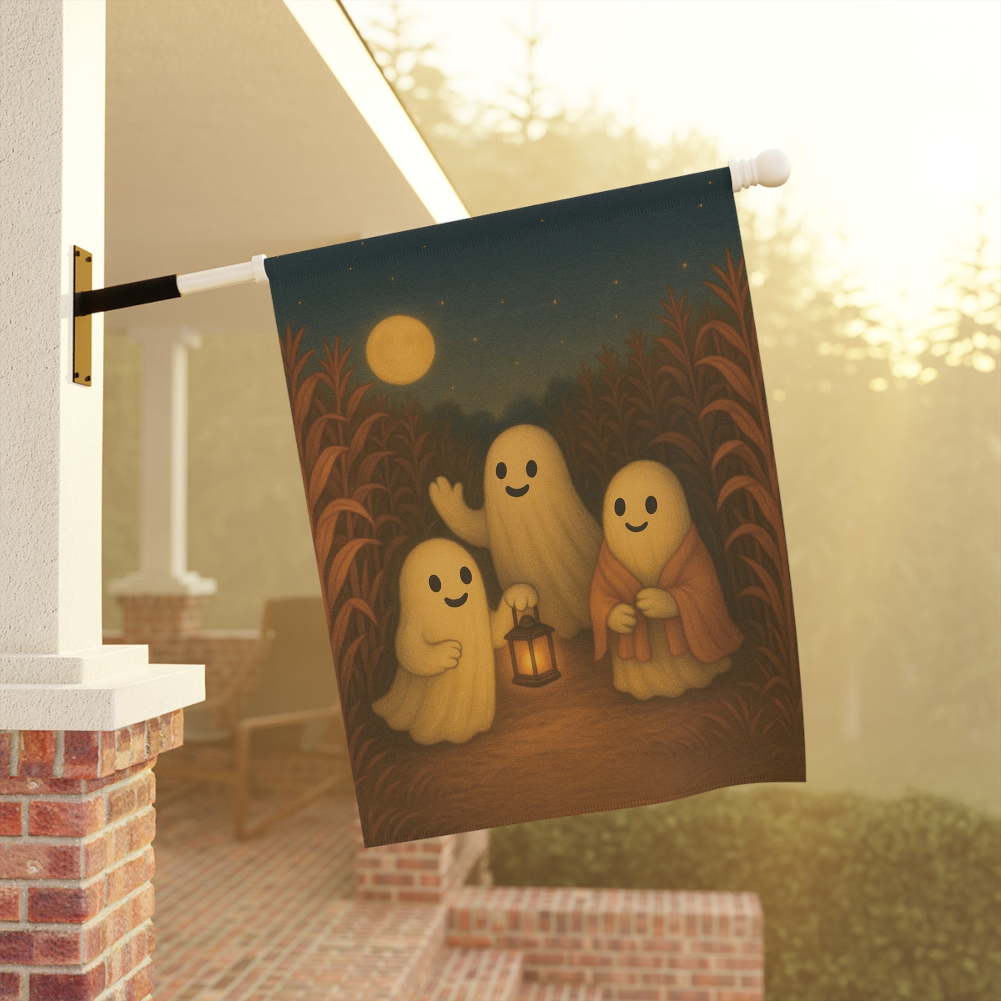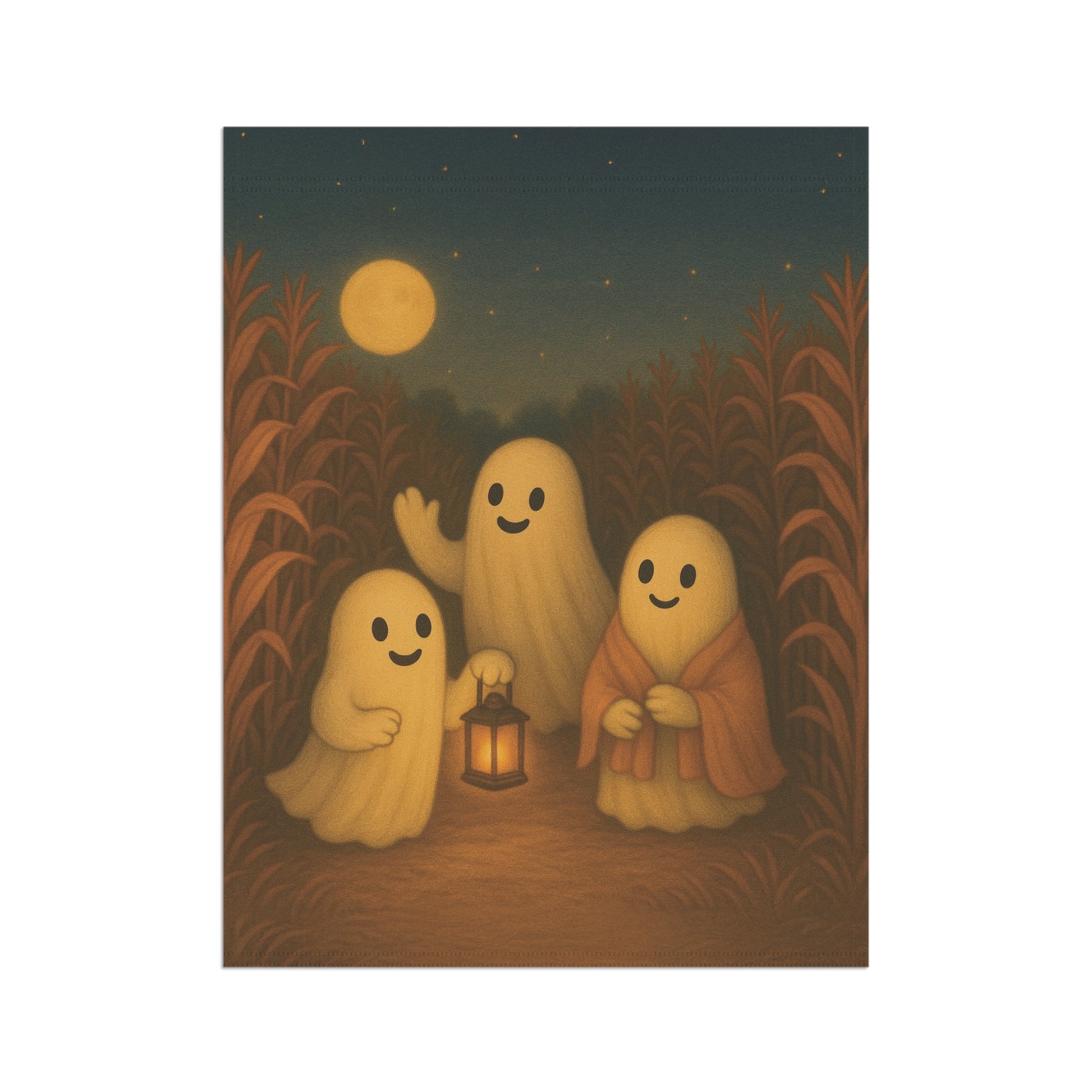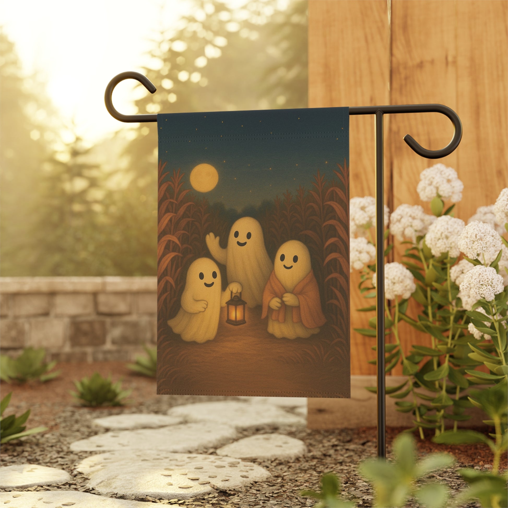 Add a warm and inviting touch to your outdoor space with this charming garden banner. Perfect for celebrating the autumn season, this decorative piece features a delightful ghosts in a corn field scene that brings a sense of fall fun. Its warm colors and whimsical design are sure to catch the eye of visitors, making it an ideal addition for family and friend gatherings. Each piece is thoughtfully designed by us with the help of AI, then professionally produced by a trusted print provider to ensure stunning quality and lasting beauty.