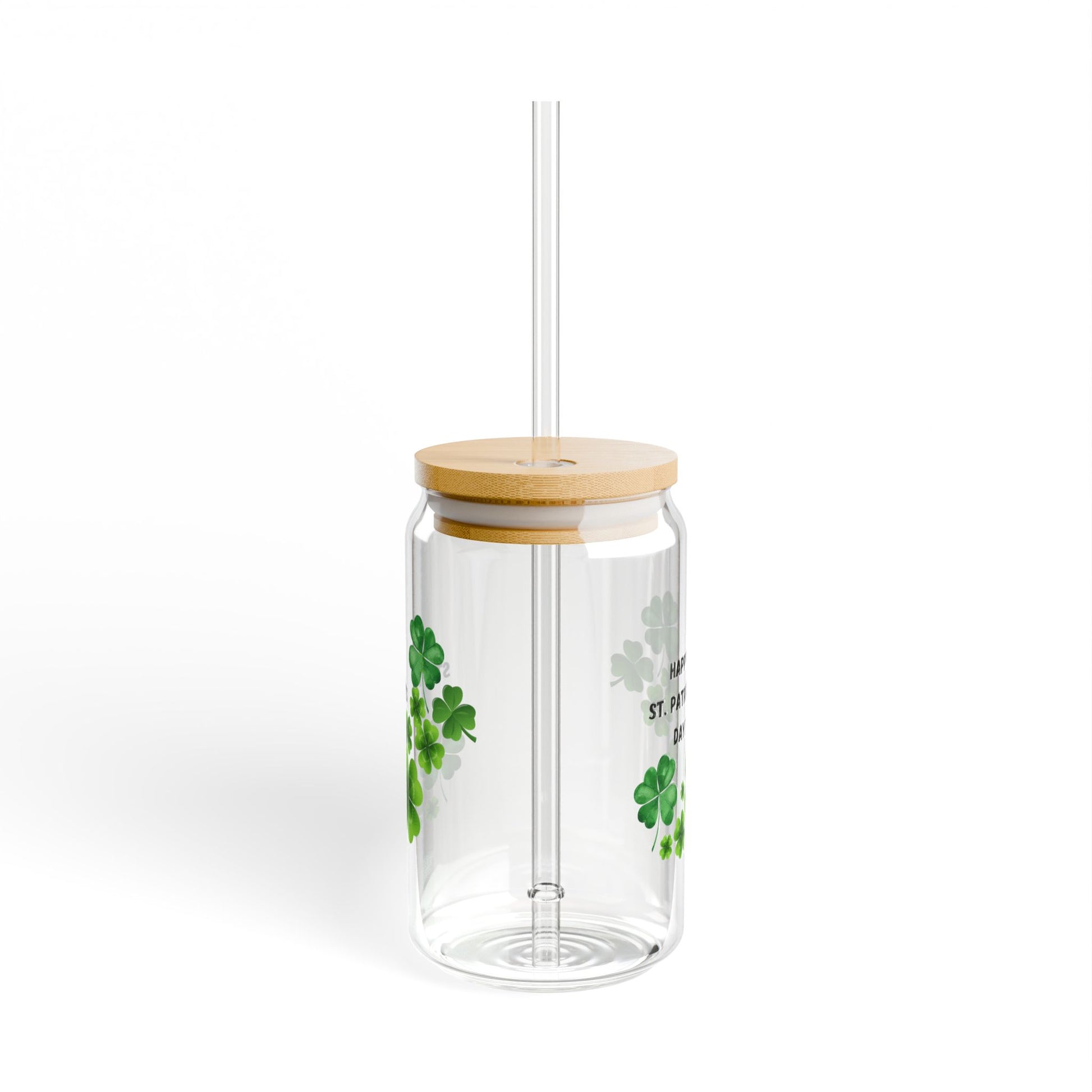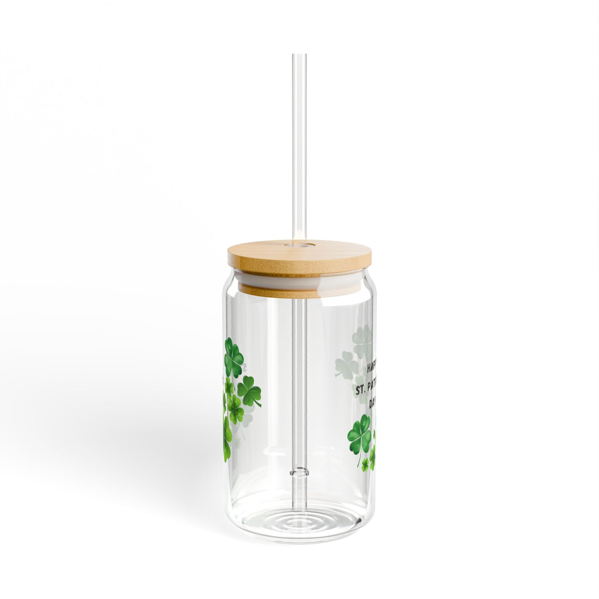 Happy St. Patrick's Day Glass Sipper - 16oz Clear Tumbler with Bamboo Lid and Straw, Clover Cup, Irish Holiday Drinkware Gift