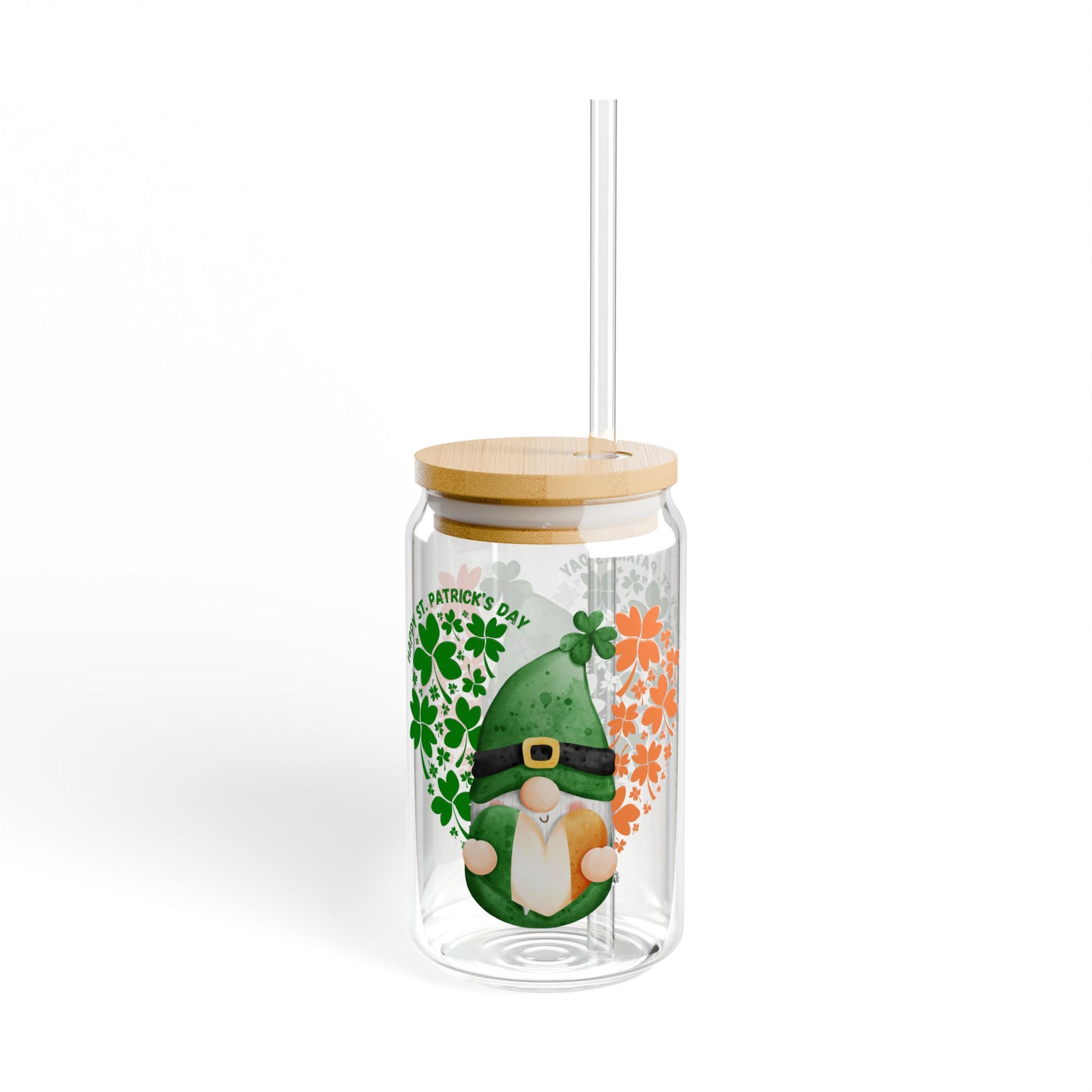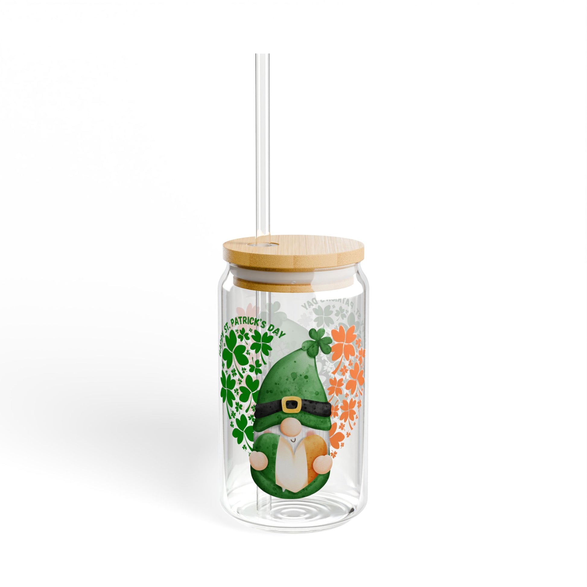 Irish Flag Gnome Glass Sipper - 16oz St. Patrick's Day Tumbler with Bamboo Lid and Straw, Shamrock Cup, Cute Irish Drinkware Gift