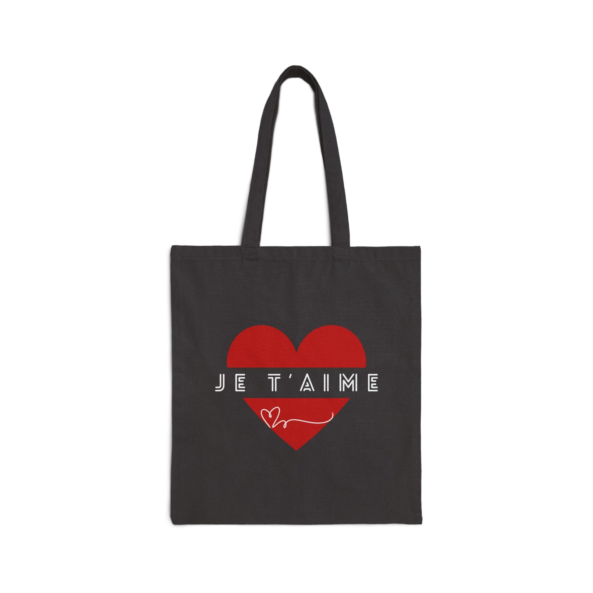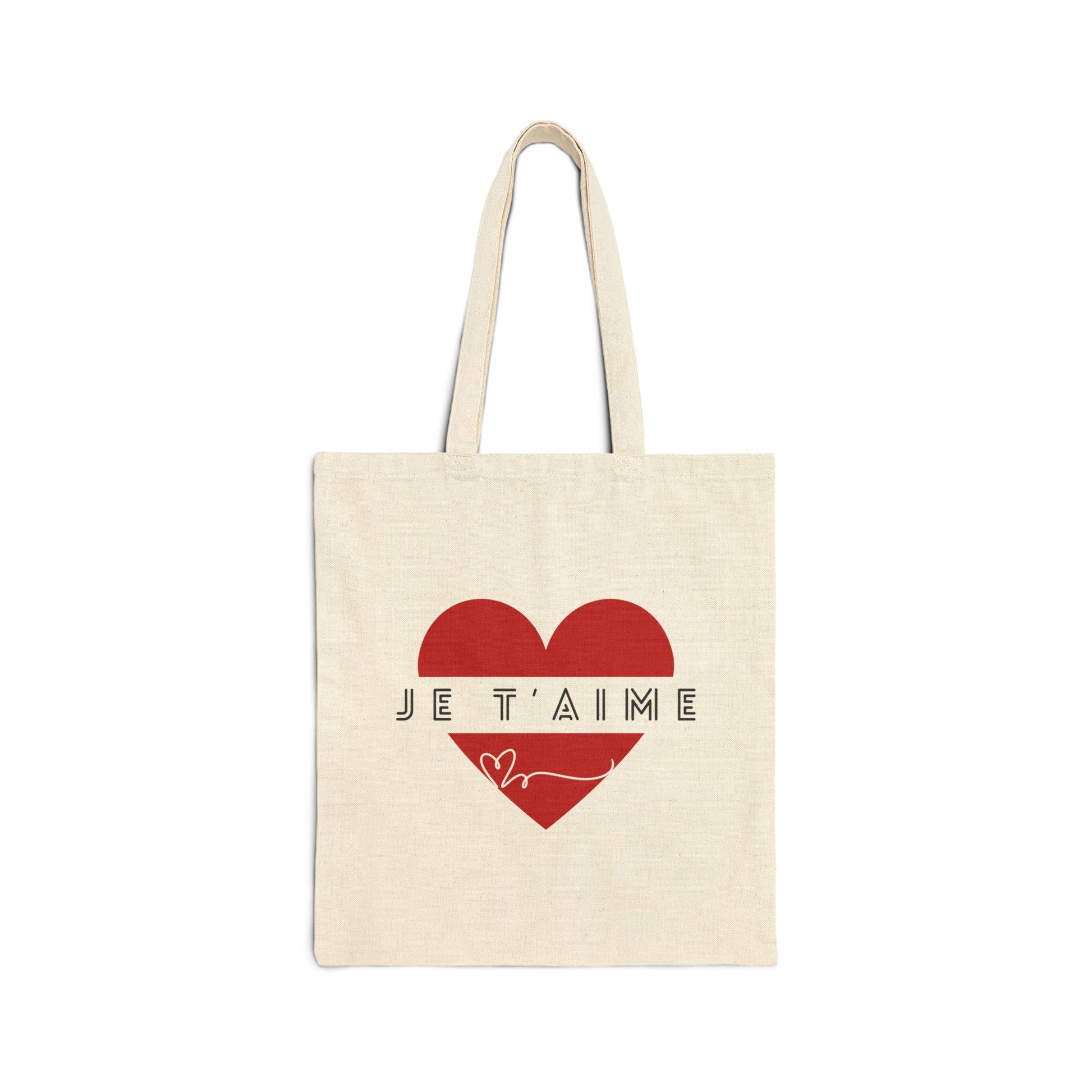 A romantic tote bag made of 100% cotton canvas featuring a large red heart and 'I love you' in French. This chic and sturdy bag is perfect for carrying groceries, books, or everyday essentials. Ideal for those who want to spread love and positivity with their accessories. This design is double-sided.
