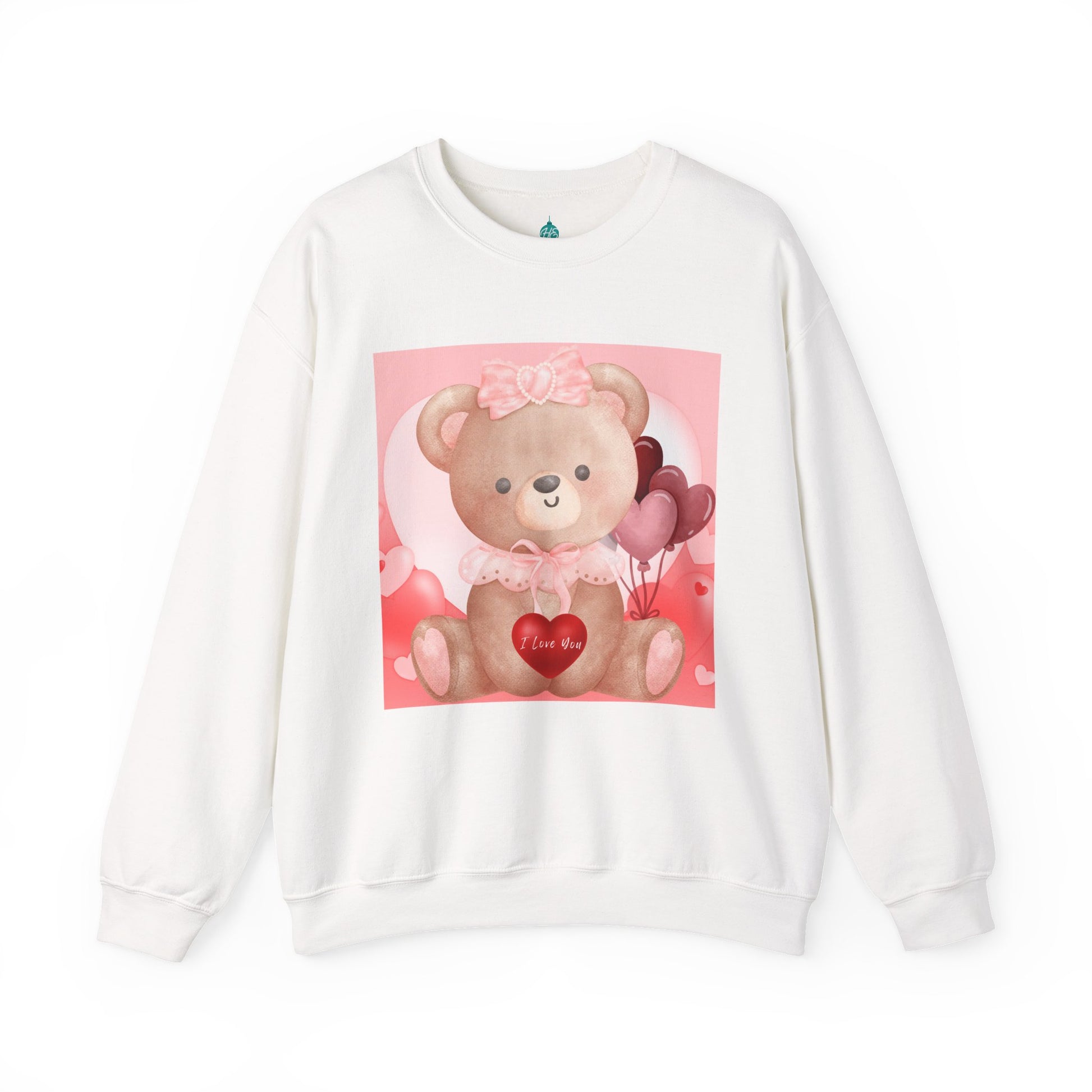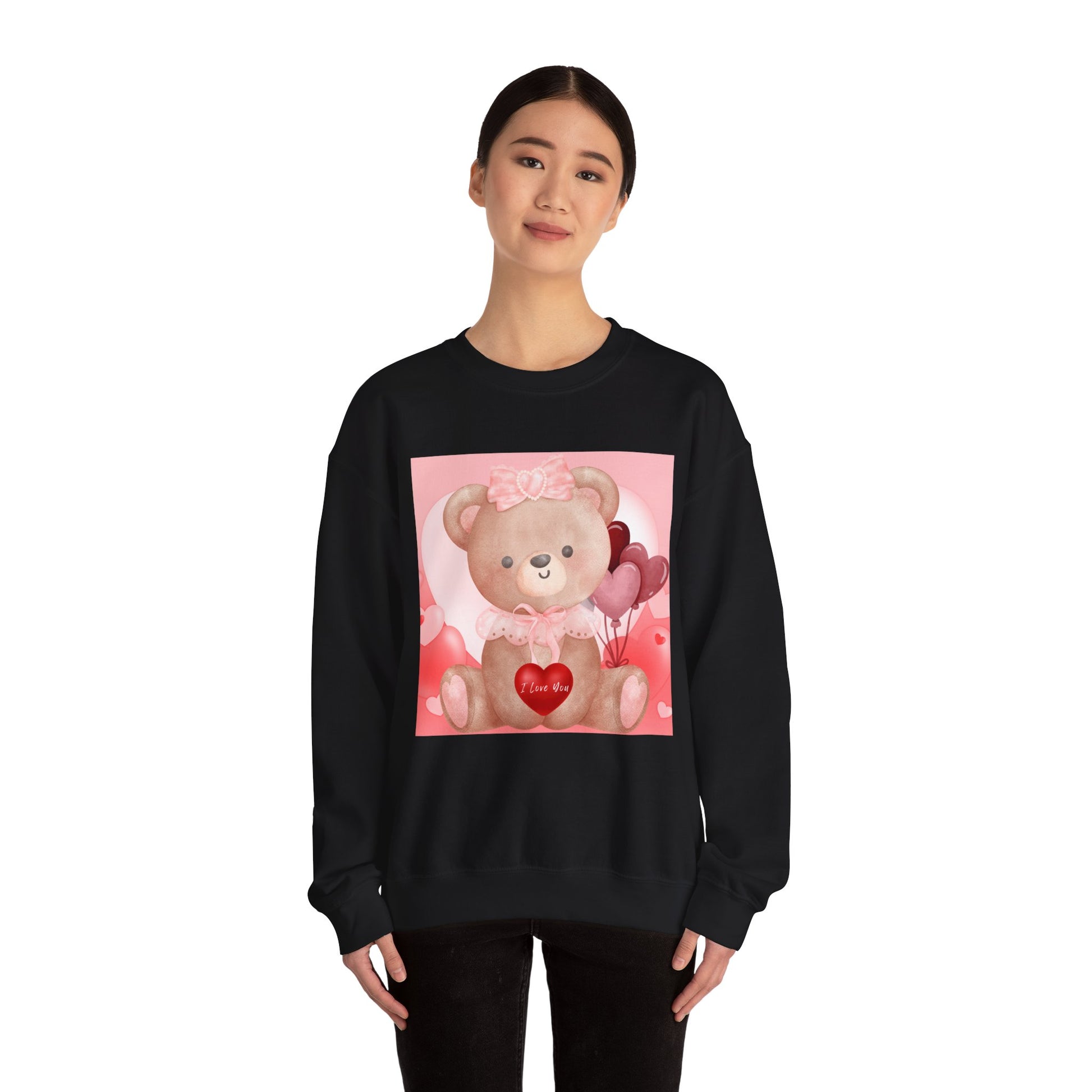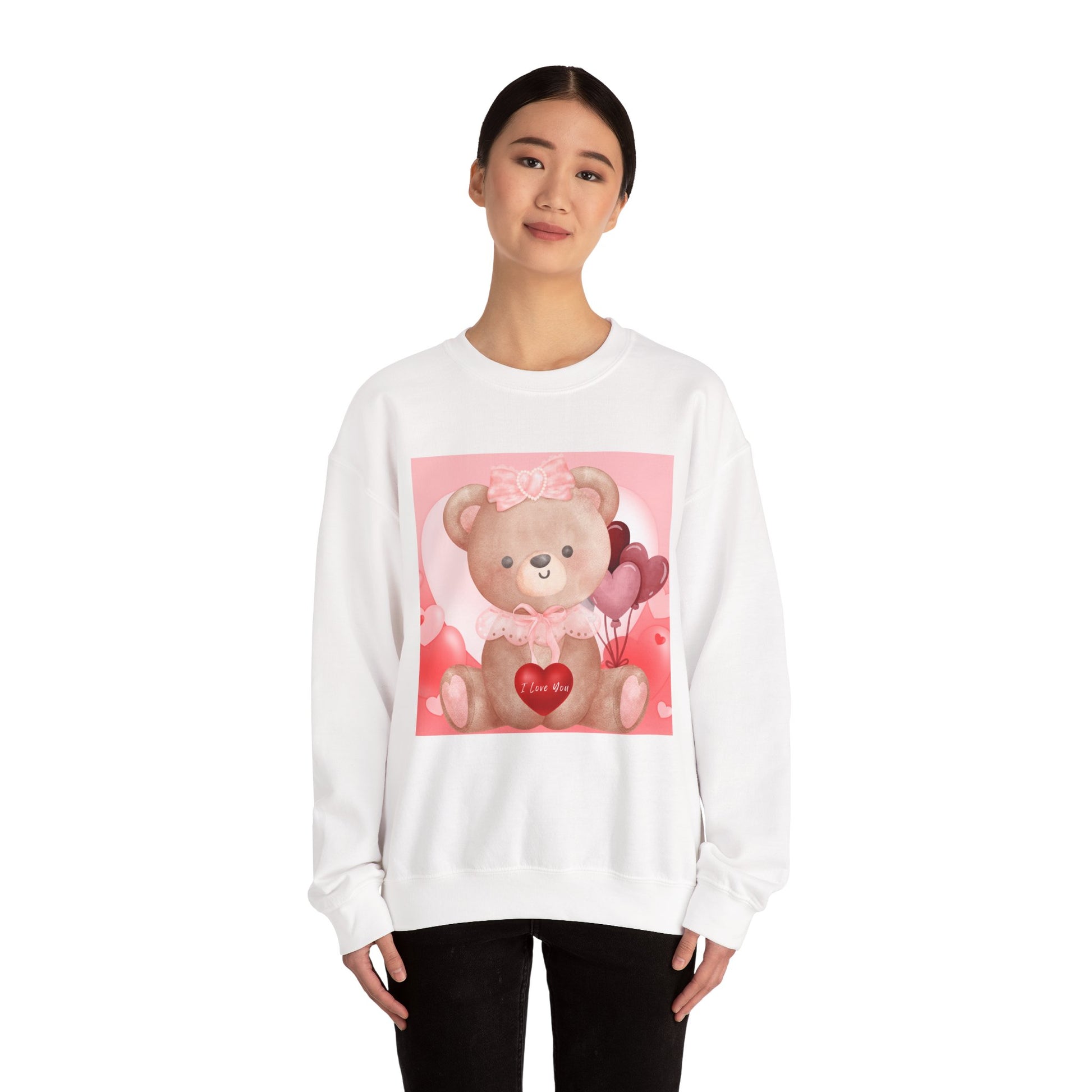 Adorable sweatshirt featuring a sweet teddy bear holding a red heart that reads “I Love You.” This pastel pink and blush design is perfect for cozy romantic vibes and makes a charming gift for loved ones.