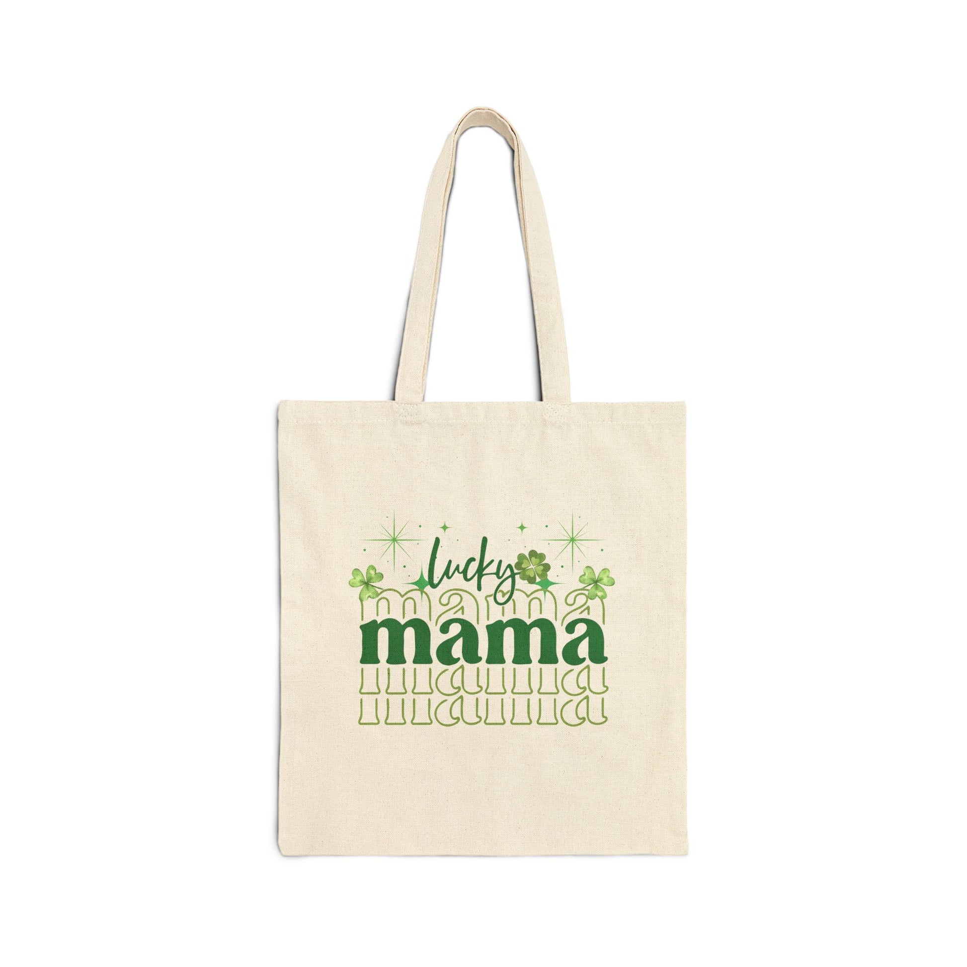 Cute Tote Bag, with an image of 4-leaf clovers with 'Lucky Mama' on it, Gift for Her, fun Canvas Handbag, Eco-Friendly Shopping Bag